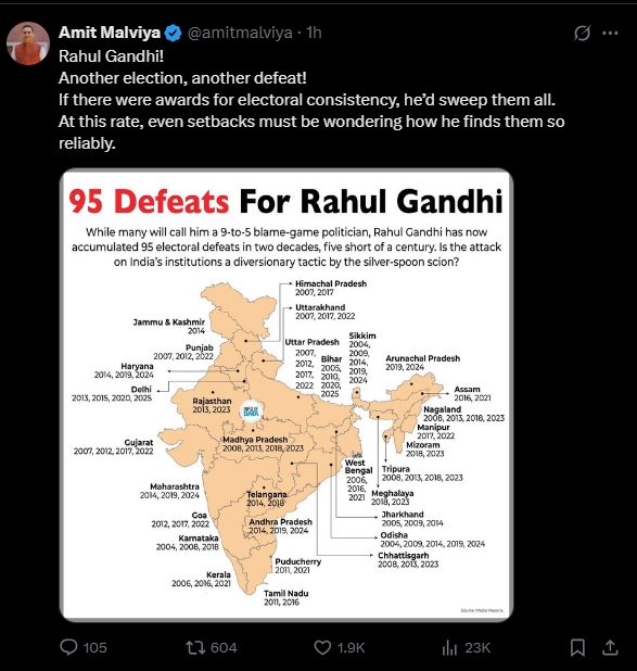 बीजेपी के आईटी सेल प्रमुख अमित मालवीय ने इस मज़ाक की अगुआई की। उन्होंने 2004 से 2025 तक उन सभी चुनावों का ग्राफिक साझा किया, जिनमें राहुल गांधी के नेतृत्व में कांग्रेस या तो सत्ता में नहीं आ सकी या चुनावी बढ़त हासिल नहीं कर पाई।